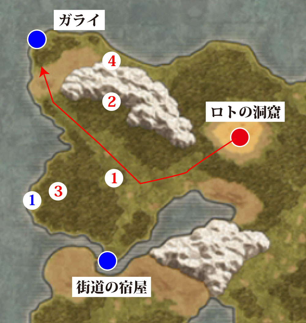 - ロトの洞窟から西にはガライの町があります。まだ用はありませんが、一度寄ればキメラのつばさでいつでも行けるようになります。