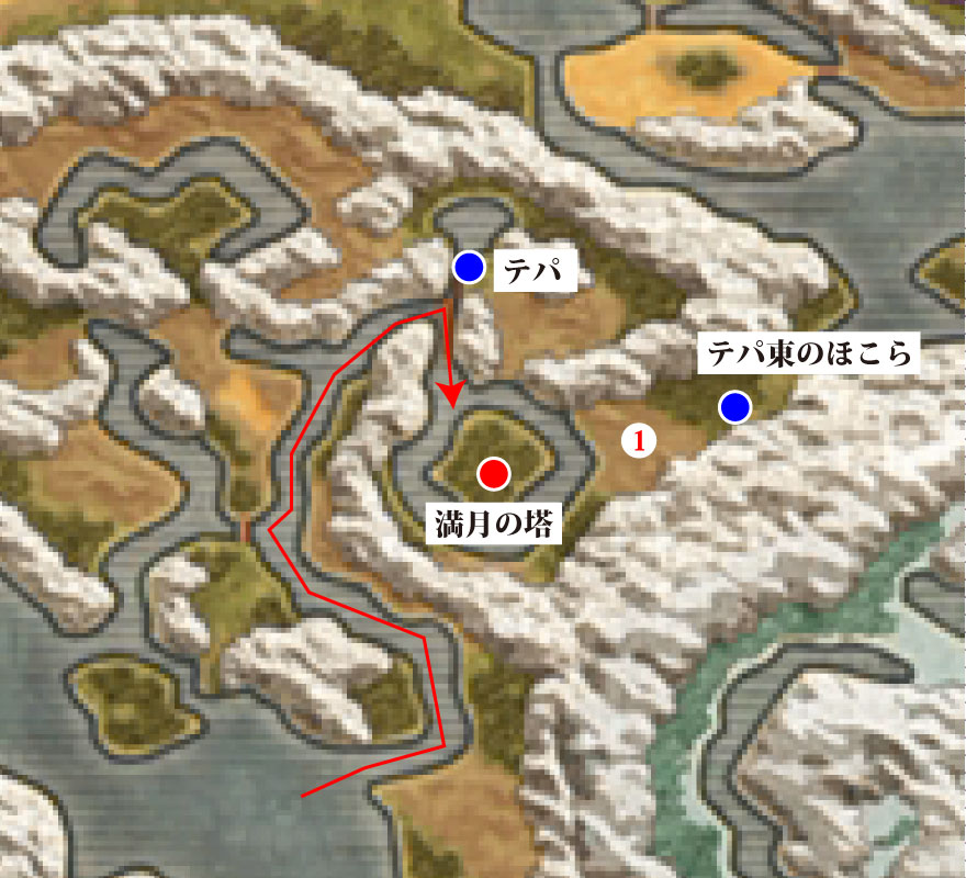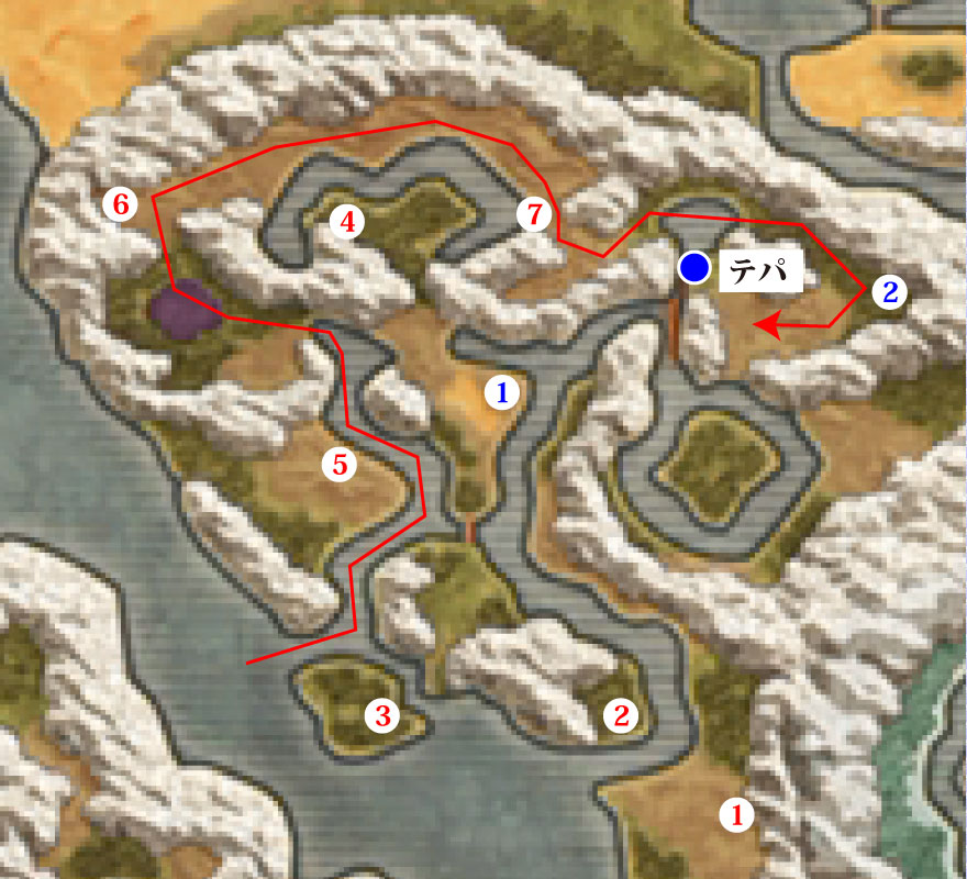 - 大陸に2つある川のうち、西側の奥まで進んで上陸し、西側から回り込んでテパに着きます。