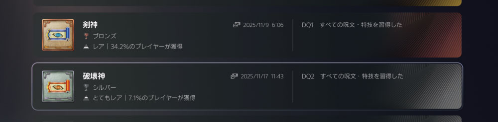 ドラクエ2のトロフィー「破壊神」は「ドラクエ2で全ての特技と呪文を習得する」というのが条件です。