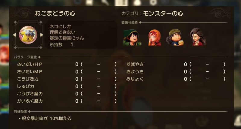 心ごとになんらかの効果があります。例えば「メタルスライムの心」は獲得経験値が増加します。