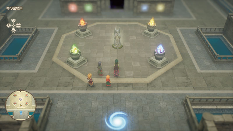 北西に炎、北東に大地、南西に風、南東に水のエリアがあり、それぞれでアミュレットを使うと中心の祭壇に光が灯っていきます。