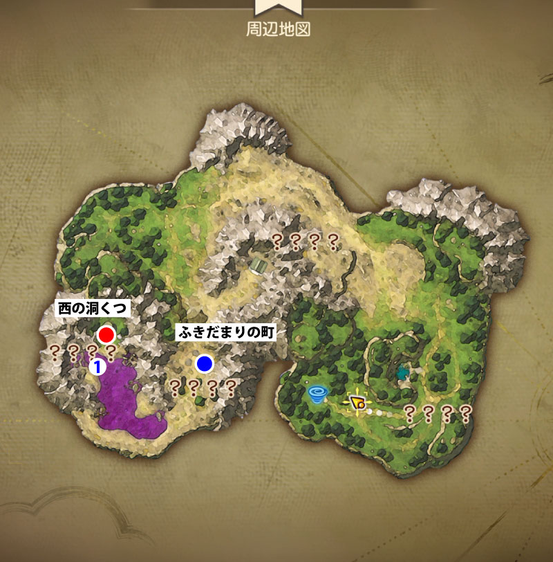 - 西の洞くつはふきだまりの町から西にあります。