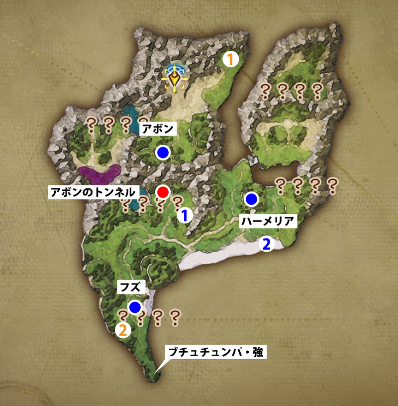 - 今までの大陸と比べると移動範囲が狭く、南側にあるアボンの村にのみ行けます。